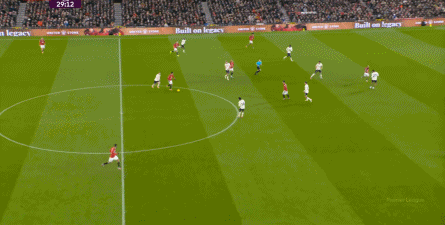 过程中,随着卢克-肖的前插,曼联投入的人手确实增加了,所以在进攻节奏没那么快,效率也没那么高的情况下,从强侧打不进去,但形成了转移,从而在弱侧完成起脚,便在禁区内让达洛特捡了一个漏。